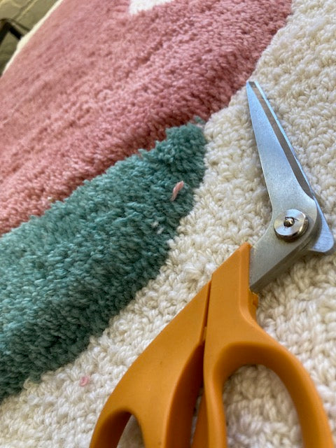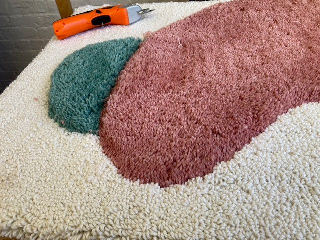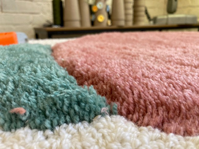 Dive into the dreamscape of your mind with "Thoughts," a whimsical pile and loop cut rug that captures the ethereal nature of imagination. Crafted from 100% New Zealand wool in soothing creams, delicate pinks, and surprising pops of turquoise, this artistic piece invites contemplation and conversation. At 38x26 inches, it's the perfect size to transform into a framed wall hanging. Let your space reflect the beautiful chaos of your inner world!